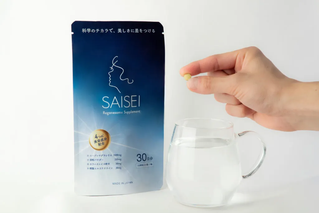 「SAISEI リジェネソームサプリメント」は、20年以上の研究を重ねた美の結晶。美と活力を保つサポートができることで有名なエルゴチオネイン、59種類の栄養素を含むユーグレナ、過酷な砂漠でもみずみずしさを保つカラハリスイカ、日本酒の発酵過程で発見された酒粕パウダー(SAKE エクソソーム含有)を高濃度で配合し、添加物※ 2不使用なのも嬉しい。科学の力で年齢に左右されない、しなやかで凛とした美しさを求める大人にふさわしいサプリメントです。